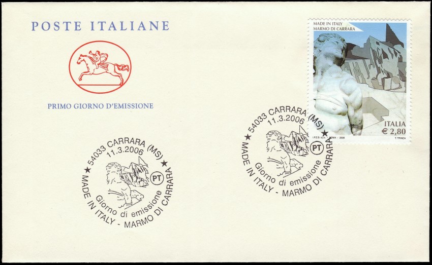 Ersttagsbrief - "Italienische Exporterfolge - Marmor aus Carrara" Der Briefumschlag ist mit einer 2.80 € Briefmarke aus dem zweiteiligen Satz Italienische Exporterfolge frankiert. Das Motiv der Marke zeigt die Silhouette eines Marmor-Steinbruches in den Bergen bei Carrara. Links davor ist ein Teil einer Statue zu sehen, welche aus dem für Carrara typischen weißen Marmor gehauen ist. Im Ersttagsstempel ist das gleiche Motiv als Zeichnung enthalten. Entwertet in Carrara / Italien - 2006 |