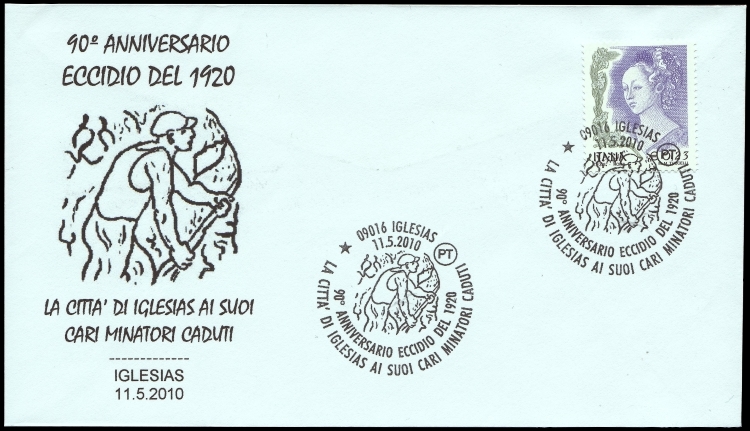 Mittelmeerinsel Sardinien gedenkt am 90. Jahrestag der blutigen Niederschlagung des sardischen Bergarbeiterstreiks im Jahr 1920 ihrer gefallenen Bergleute. Der Briefumschlag ist mit einer 0,23€ Briefmarke aus 2002 (ohne Bezug zum Thema) frankiert. Das Schmuckmotiv des Umschlages zeigt einen Bergmann mit Gewehr. Das gleiche Motiv und den Hinweis zum Ausgabeanlass enthält der Postsonderstempel. Entwertet in Iglesias-Sardinien / Italien – 2010 |