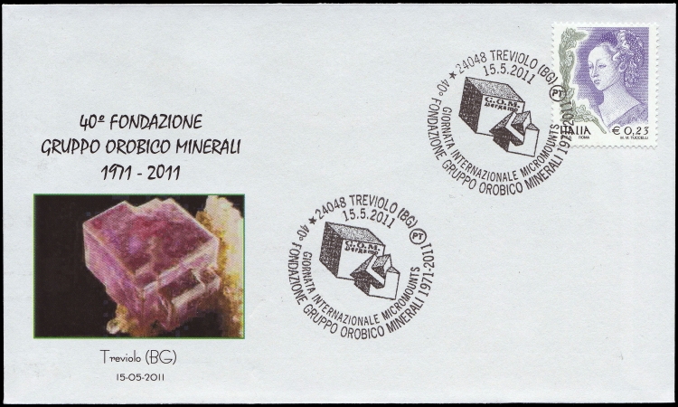 Lokaler Schmuckbrief - “Internationaler Mikromount-Tag 2011“ in Treviolo (Bergamo) Der Briefumschlag ist mit einer 0,23€ Briefmarke aus 2002 (ohne Bezug zum Thema) frankiert. Das Schmuckmotiv des Umschlages zeigt einen Fluoritkristall und den Hinweis auf das 40jährige Bestehen der Vereinigung Orobischer Mineraliensammler, Treviolo. Der Postsonderstempel verweist ebenfalls auf Veranstalter und Anlass, in der Mitte des Stempels befindet sich das Logo der Vereinigung. Entwertet in Treviolo / Italien – 2011 |