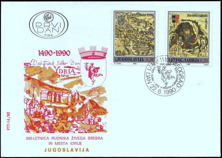 Ersttagsbrief “500 Jahre Quecksilber-Bergwerk Idrija“ Der Ersttagsbrief ist mit zwei Briefmarken frankiert, welche als Motive eine mittelalterliche Ansicht von Idrija und eine Bergbauszene untertage zeigen. Auf dem Briefumschlag ist als Motiv ebenfalls die mittelalterliche Ansicht von Idrija zu sehen. Auf der 0.70 Marke im Umschlagmotiv und im Ersttagsstempel ist das Wappen von Idrija enthalten. Entwertet in Belgrad, Jugoslawien – 1990 |