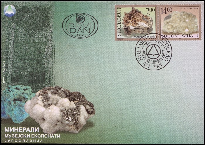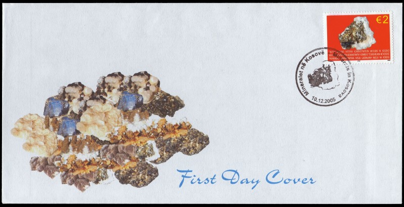 Ersttagsbrief - "Mineralien" Auf der Briefmarke, dem Motiv des Umschlags sowie im Ersttagsstempel ist jeweils eine Chalkopyritstufe aus Trepcá abgebildet. Kosovo - 2005 |