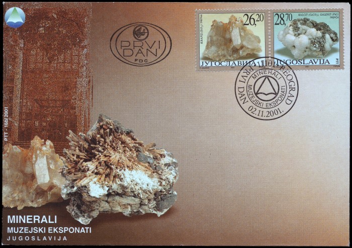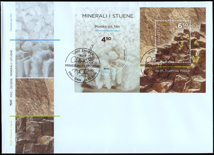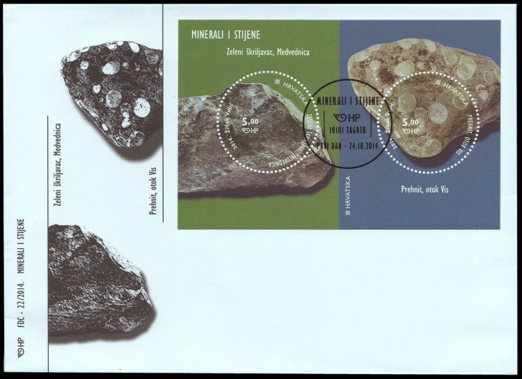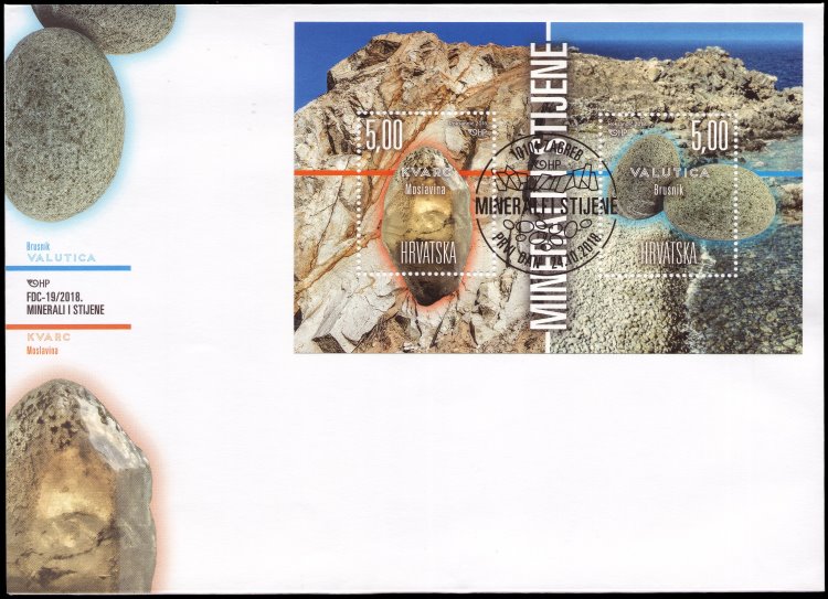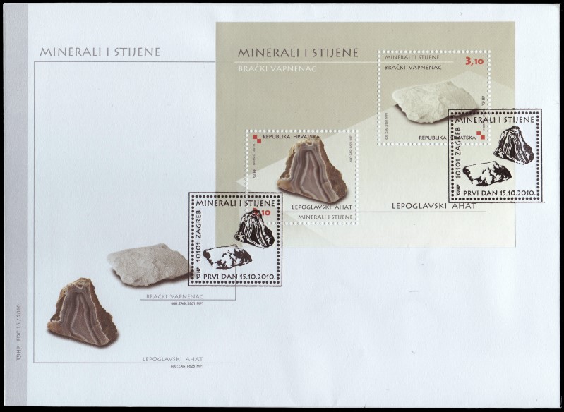 Ersttagsbrief - “Mineralien und Gesteine“ Der Briefumschlag ist frankiert mit zwei Briefmarken welche einen angeschliffenen Achat von Lepoglava und derben Calcit von Vapnenac, Insel Brac zeigen. Schmuckmotiv und Postsonderstempel zeigen die gleichen Motive. Entwertet in Zagreb, Kroatien - 2010 |