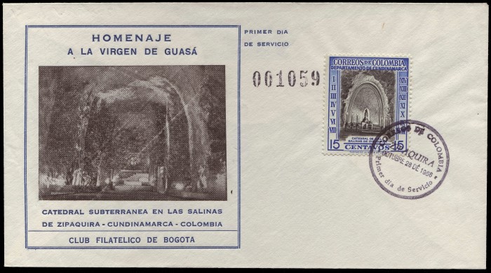Ersttagsbrief - "Gedenken an die Jungfrau von Guasá" Umschlag- und Briefmarkenmotiv zeigen die unterirdische Salzkathedrale von Zipaquira. Entwertet in Zipaquira, Kolumbien - 1956 |