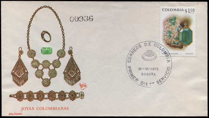 Ersttagsbrief - "Kolumbianischer Schmuck" Das Umschlagmotiv zeigt verschiedenen kolumbianischen Schmuck. Auf der $1.10 Briefmarke ist eine Smaragdstufe und ein Anhänger mit eingefasstem Smaragd abgebildet. Entwertet wurde die Marke durch einen Ersttagsstempel mit dem Motiv eines Ringes. Entwertet in Bogota, Kolumbien - 1972 |