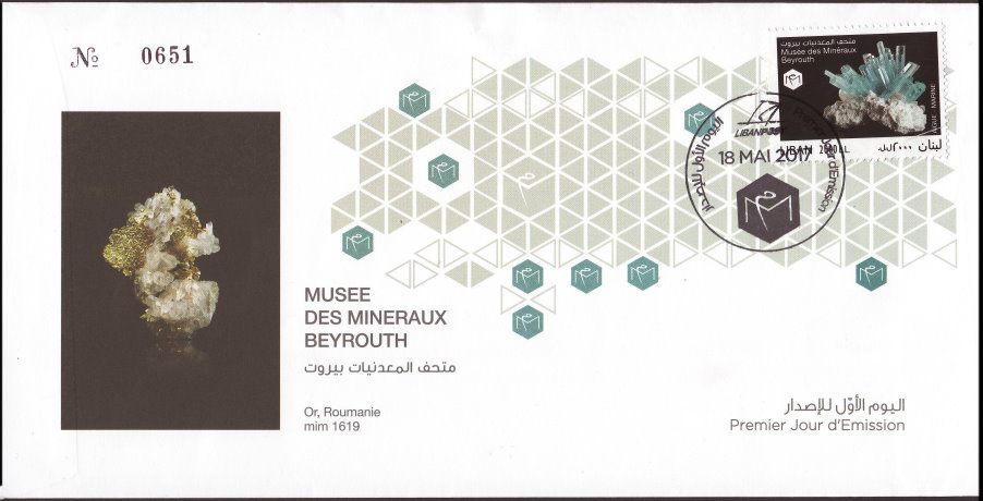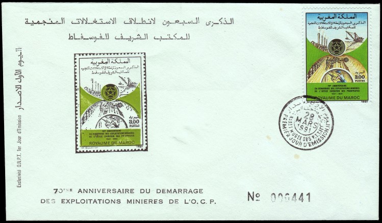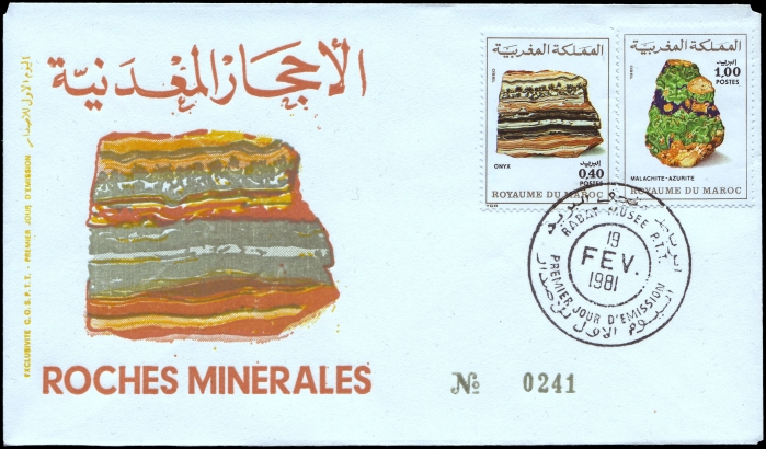 Ersttagsbrief - "Mineralien aus Marokko" Frankiert mit zwei Briefmarken die als Motiv die Mineralien Onyx und Malachit-Azurit zeigen. Auf dem Umschlagmotiv ist der gleiche Onyx wie auf der Marke abgebildet. Entwertet in Rabat, Marokko - 1981 |