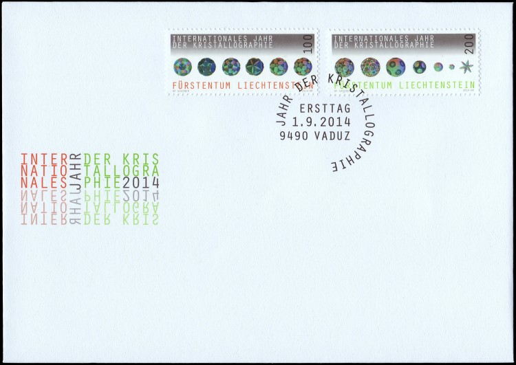 Ersttagsbrief - "Internationales Jahr der Kristallographie" Frankiert mit zwei Briefmarken Metamorphose Sequenz 1 und 2 zu 1 und 2 CHF, welche aneinander gereiht die Entwicklung eines Kristalls über die Jahrtausende darstellen. Als Besonderheit kann man eine kostenlose App SEPAC Stamps herunterladen, die Briefmarken damit einscannen und die Metamorphose eines Kristalls als Videoanimation betrachten. Auf dem Briefumschlag und im Ersttagsstempel wird auf den Ausgabeanlass hingewiesen. Entwertet in Vaduz, Liechtenstein - 2014 |