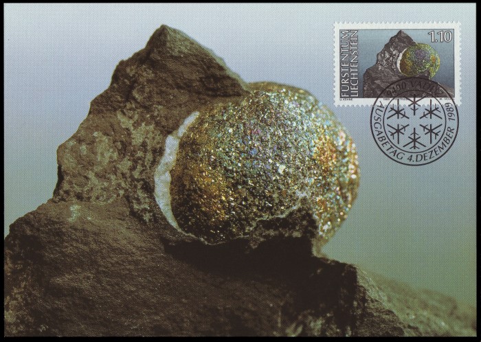 Maxikarte - Erstausgabetag - "Mineralien" Briefmarken- und Kartenmotiv zeigen eine Pyritkugel. Liechtenstein - 1989 |