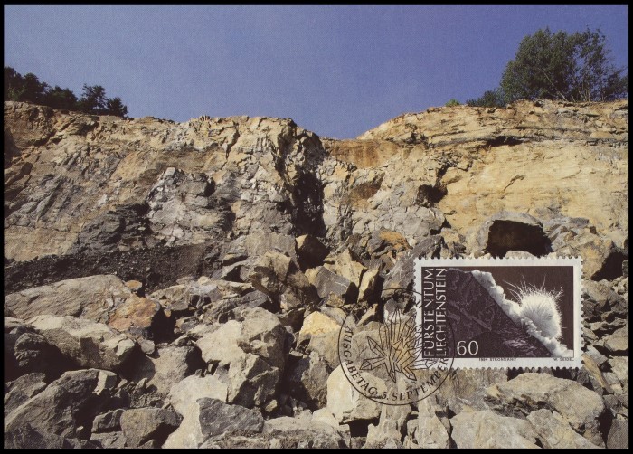 Maxikarte - Erstausgabetag - "Mineralien II" Die Briefmarke zeigt eine Abbildung von Fadenquarz. Das Kartenmotiv zeigt den Fundort-Steinbruch Ruggell. Im Ersttagsstempel ist eine Kristallgruppe abgebildet. Liechtenstein - 1994 |