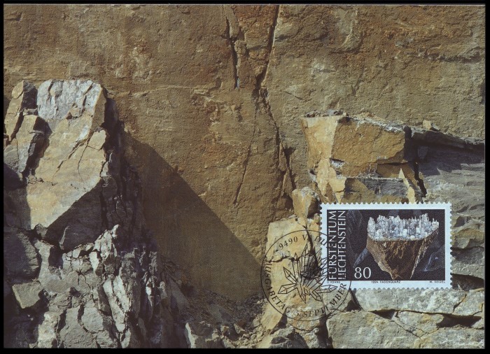 Maxikarte - Erstausgabetag - "Mineralien II" Auf der Briefmarke sind Strontianitkristalle abgebildet. Das Kartenmotiv zeigt den Fundort-Steinbruch Ruggell. Im Ersttagsstempel ist eine Kristallgruppe abgebildet. Liechtenstein - 1994 |