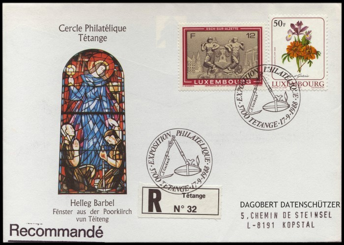 Echt gelaufener, als Einschreiben deklarierter regionaler Schmuckbrief zur "Briefmarkenausstellung in Tetange/Luxemburg" Das Motiv des Umschlages zeigt die Schutzpatronin der Bergleute, die Heilige Barbara in einem Kirchenfenster der Poorkirche dem Motiv einer Tunnellampe.in Tetnang. Frankiert u. a. mit Briefmarke F12 Bergbau-Monument in Esch-Sur-Alzette und entwertet durch Sonderstempel mit Luxemburg - 1988 |