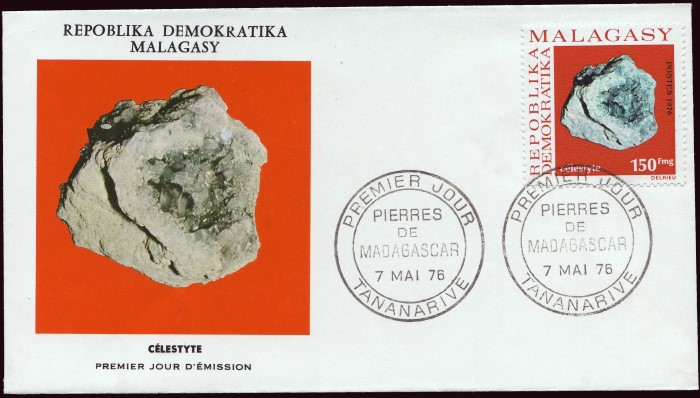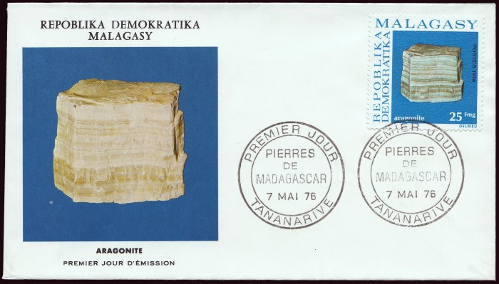 Ersttagsbrief - "Steine aus Madagaskar" Auf der Briefmarke und dem Briefumschlag ist das Mineral Aragonit abgebildet. Entwertet in Tananarive, Madagaskar - 1976 |
