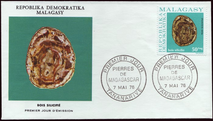 Ersttagsbrief - "Steine aus Madagaskar" Auf der Briefmarke und dem Briefumschlag ist Versteinertes Holz abgebildet. Entwertet in Tananarive, Madagaskar - 1976 |