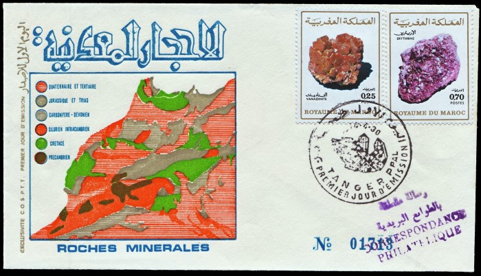 Ersttagsbrief - "Mineralien aus Marokko" Frankiert mit zwei Briefmarken, welche als Motiv die Mineralien Vanadinit und Erythrin zeigen. Auf dem Umschlagmotiv ist die geologische Karte von Marokko abgebildet. Im Ersttagsstempel ist eine Kristallstufe abgebildet. Entwertet in Tanger, Marokko - 1974 |
