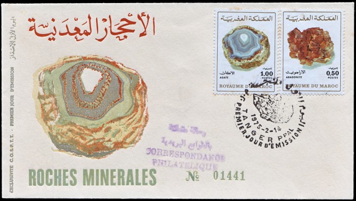 Ersttagsbrief - "Mineralien aus Marokko" Frankiert mit zwei Briefmarken die als Motiv die Mineralien Aragonit und Achat zeigen. Auf dem Umschlagmotiv ist ein Achat abgebildet. Im Ersttagsstempel ist eine Kristallstufe abgebildet. Entwertet in Tanger, Marokko - 1975 |