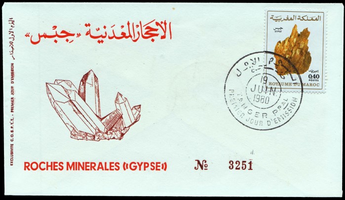Ersttagsbrief - "Mineralien aus Marokko" Das Motiv der Briefmarke zeigt eine Gipsstufe. Auf dem Umschlagmotiv ist eine Kristallstufe abgebildet. Entwertet in Tanger, Marokko - 1980 |