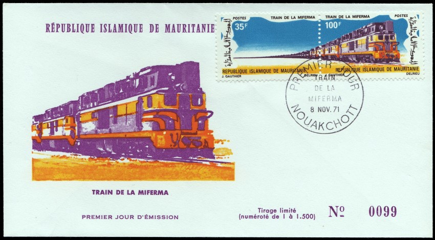 Ersttagsbrief - "Zug der MIFERMA" Auf der Doppelbriefmarke 35F und 100F sowie dem Umschlag ist der Ertransportzug der MIFERMA - der vermutlich längste Zug der Welt - abgebildet. Entwertet in Nouakchott, Mauretanien - 1971 |