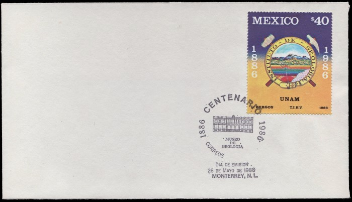 Ersttagsbrief - "Hundertjähriges Bestehen des Geologischen Museums" von Mexico Auf der Briefmarke abgebildet sind Geologenhämmer sowie ein geologischer Schnitt durch die Erdkruste. Der Ersttagsstempel enthält eine Silhouette des geologischen Museums. Entwertet in Monterrey, Mexico - 1986 |