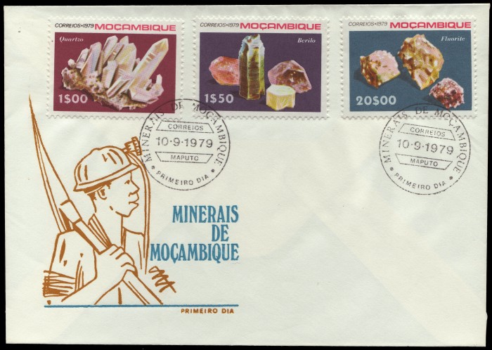 Ersttagsbrief - "Mineralien aus Mocambique" Auf den Briefmarken abgebildet sind die Mineralien 1$00 Quarz, 1$50 Beryll und 20$00 Fluorit. Das Umschlagmotiv zeigt einen einheimischen Bergmann mit elektrischer Kopflampe und Doppelkeilhaue. Entwertet in Maputo, Mosambik - 1979 |