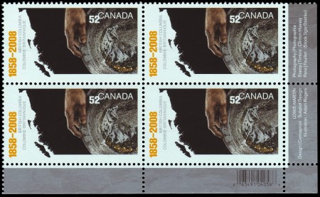 Goldwaschpfanne vor der Silhouette von Britisch-Columbia Rückseite des Selbstklebemarkenbogens - Historische Aufnahmen vom Goldrausch