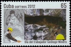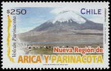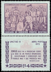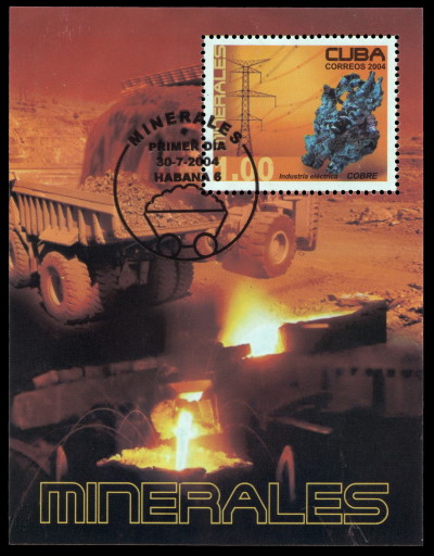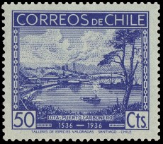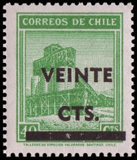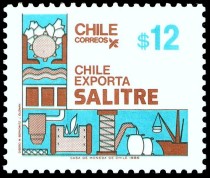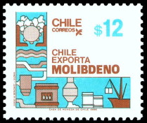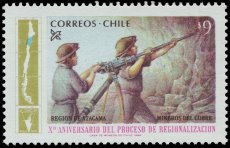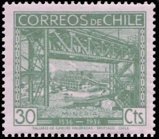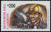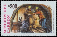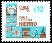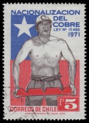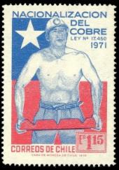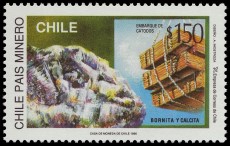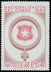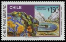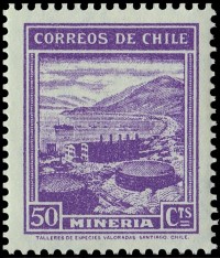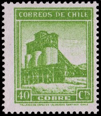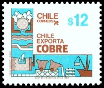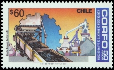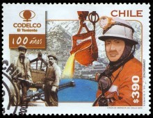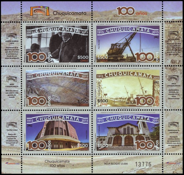 Chilenischer Präsident gibt 1915 Startschuss zum Abbau der Lagerstätte - 22 Jahre lang weltgrößter Schaufelbagger Chuquicamata-Kupfermine mit dem weltgrößten Tagebau - Emblem am Eingangstor zum Minengelände 1943 eröffnetes Theater auf dem Minengelände - 1917 gegründte Katholische Pfarrei El Salvador auf dem Bogen der Tagebau und der Ausgabeanlass mit dem Minen-Emblem an den Rändern Erläuterungen zu den Marken und das Minen-Emblem |