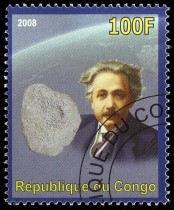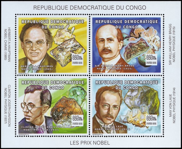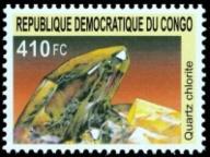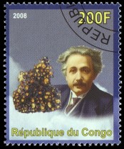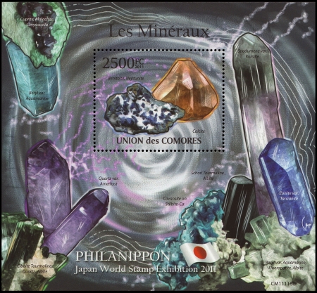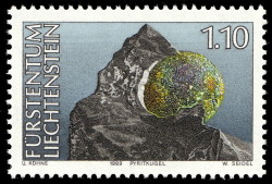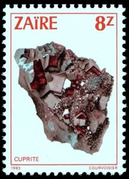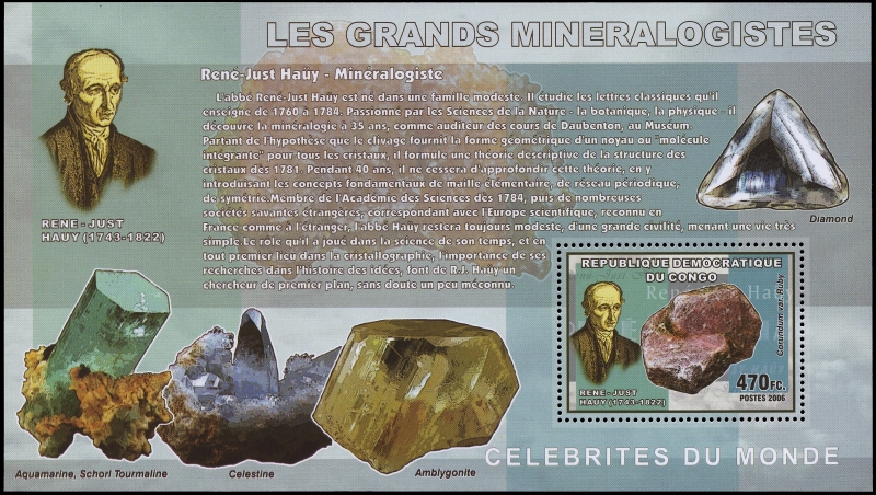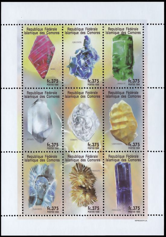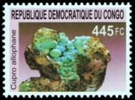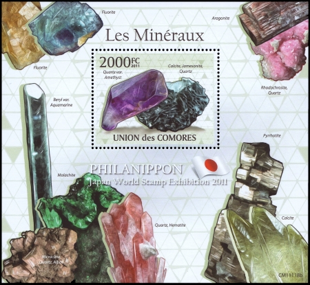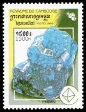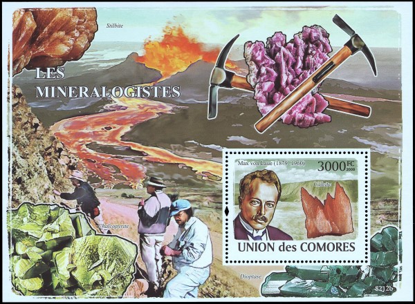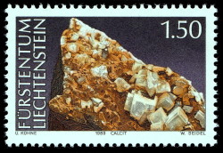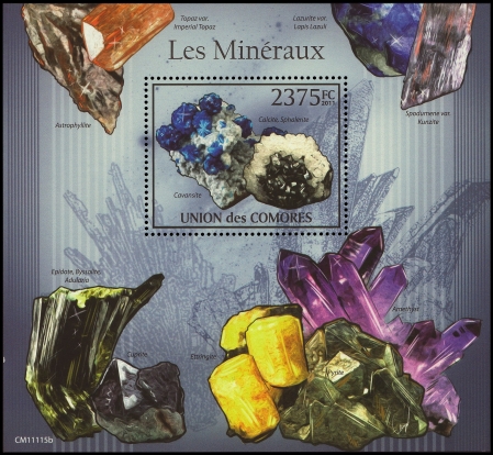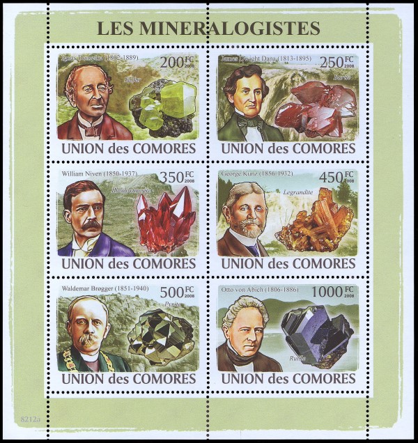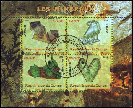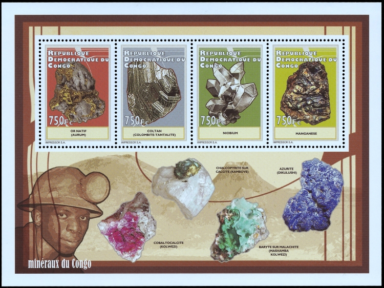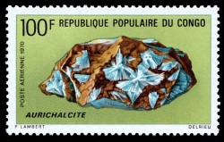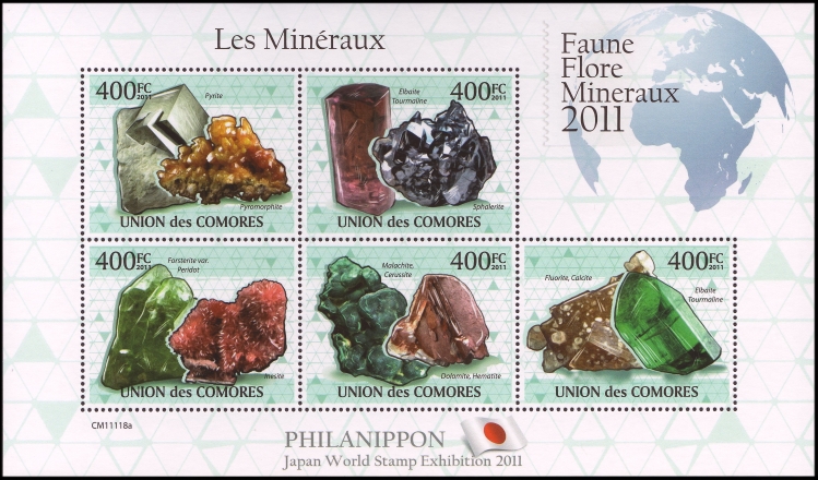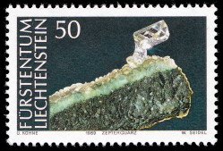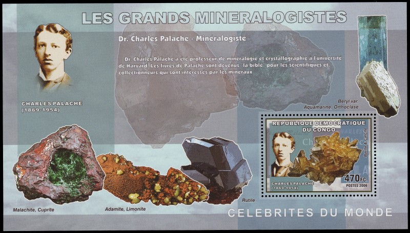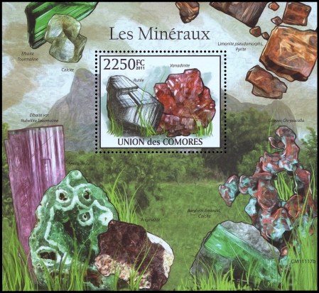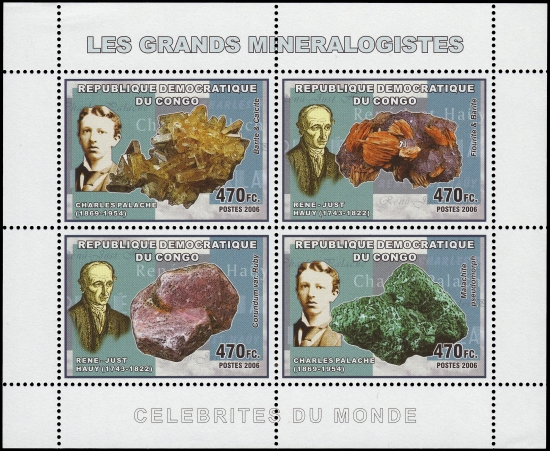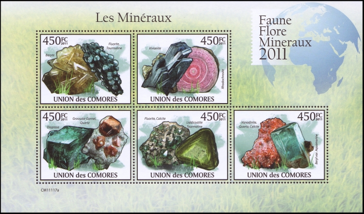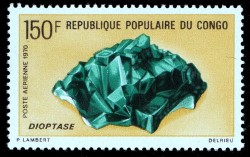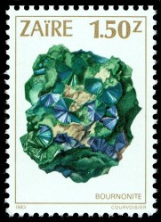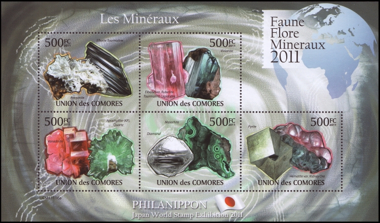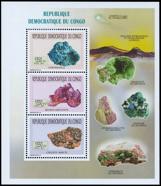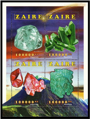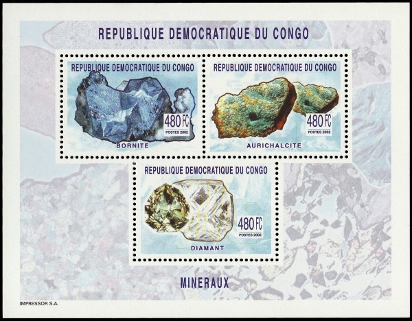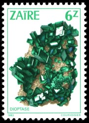 Auf dem Bogen die Mineralien Stilbit, Chalkopyrit, Dioptas und ein unbekanntes Mineral (Erythrin ?)